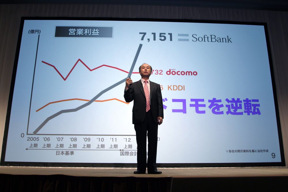Masayoshi Son presents earnings figures in October, 2013. Photographer: Junko Kimura/Bloomberg ___________________________________