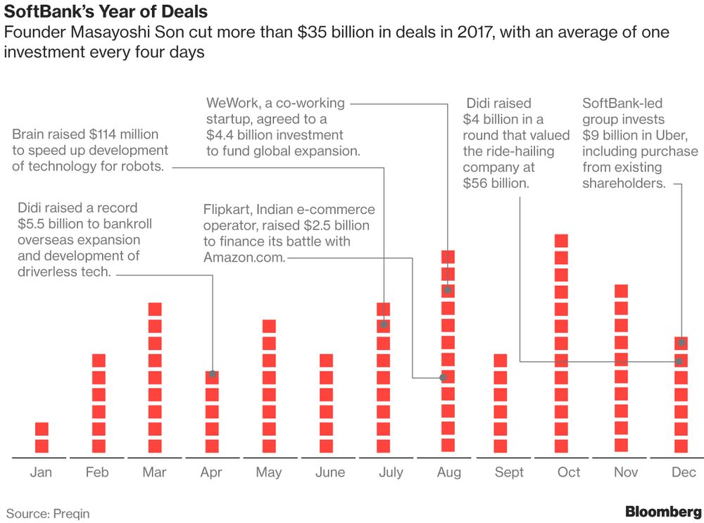 While some question the wisdom of giving entrepreneurs more cash than they're looking for, there's another way to look at Son's 2017 Blitzkrieg. He's gotten SoftBank big stakes in more than a dozen of the most prominent startups in the world, including the two most valuable (Uber and Didi). In the process, he's shown he can help entrepreneurs chase ambitious, expensive dreams with a single check. “For all of the founders I work with, he is now the first name on their list,” says Mark Tluszcz, who co-founded the venture firm Mangrove Capital Partners.