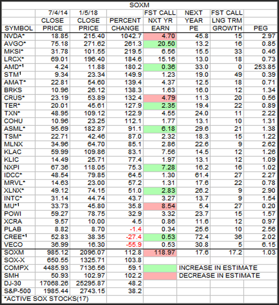 The table also shows over this period that NVDA was the big winner with a 10 bagger greatly out distancing the other 27 SOXM stocks. However, 12 stocks have exceeded 100% gains over the period. Only PLAB, CREE and VECO have lost value.