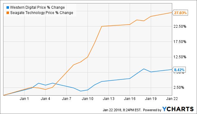 The market has two main players in the hard disk drive (HDD) arena: Western Digital (NASDAQ: WDC) and Seagate Technology (NASDAQ: STX). Despite these stocks historically moving rather close in tandem with each other - as they both occupy a near carbon-copy of each other's businesses - their performance has diverged rather noticeably in the first month of 2018.
