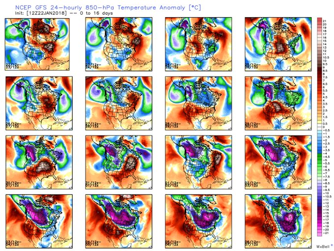 When looking at the GFS 16 day 850hPa temperature anomaly we can see how the cold builds in Northwest Canada and dives Southeast into the Eastern US by the end of the period