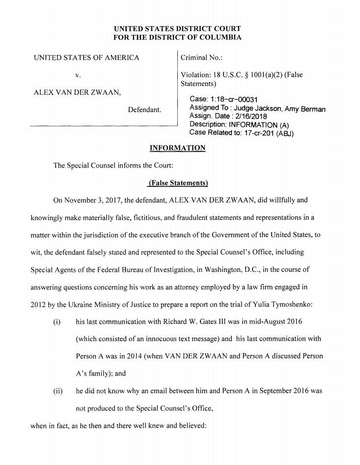 Zoe TillmanVerified account @ZoeTillman BREAKING: New case from the special counsel's office. Defendant is Alex Van Der Zwaan, charged with making false statements. He has a plea hearing scheduled for today at 2:30pm assets.documentcloud.org …