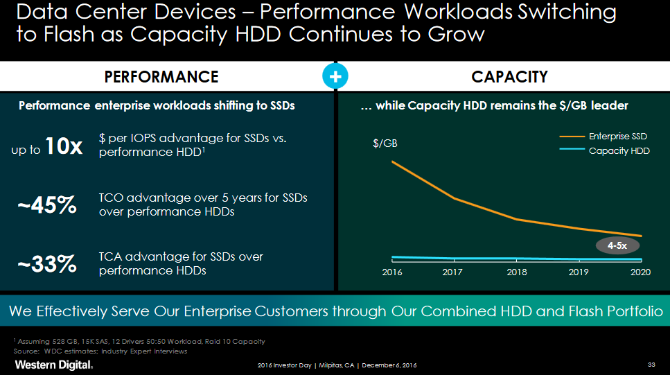 In the last quarter, HDD revenue fell compared to the prior year, but was up sharply over the previous quarter as average selling prices improved. This reflected a higher percentage of HDDs being deployed in the enterprise market. WDC has an excellent product line to address this market including the helium-filled 10TB and 12TB drives. Meanwhile, HDDs continue to provide a 4-5x cost advantage ($/GB) over SSDs in a data center market: