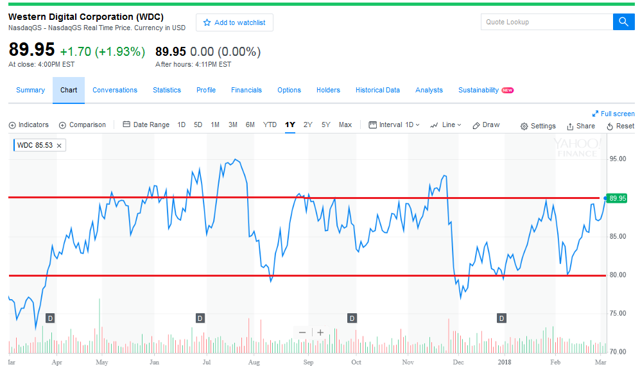 So far, neither appears to be the case. And while I'm sure management had already baked in the significant debt restructuring savings into its FY18 guidance, there's no doubt they have now achieved those savings and continue to execute according to plan. As a result, I reiterate my $115 PT and buy rating on WDC. In addition, the $0.50 quarterly dividend means the stock currently yields ~2.2%. If you are not convinced yet - and don't want to buy WDC at the top of its $80-$90 range (see graph below), which is where it stands today, you may want to wait and see if it makes another round trip back down to $80.