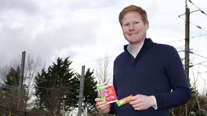 Mr Minch-Dixon says the cost of using the Tipa packaging for his products has fallen by 60% in two years, as more companies have adopted it. This means the snacks cost him just 1p more per item to produce than if he'd used traditional plastic.
