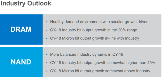 Supply growth has been expected in 2018 for quite some time. Micron itself, as shown in its guidance slide, is pointing to 20% industry bit output growth, and other observers have cited a range of as high as 30% output growth. We've known for quite some time that yields would improve this year and that production would ramp, but is this any cause to run for the hills?