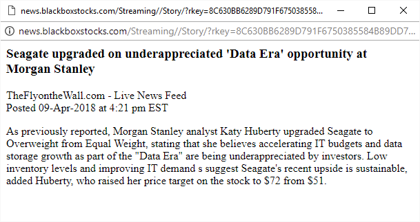 Katy strikes again! She is so funny, giving STX a valuation of 14X earnings but thinks WDC isn't even worth 6X. If WDC gets same valuation then she will have the same PT as my $200 year end PT for the stock. Either she is one dumb squirrel or an upgrade of WDC will soon follow IMHO.......