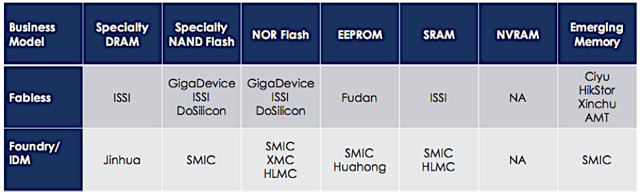 China has several companies involved in the specialty memory area. But China memory companies are too small to really be a concern for global memory companies, and could potentially help the industry as the industry is over consolidated.