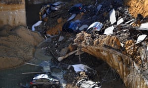 A street in the Balduina district in Rome shows a huge sinkhole that swallowed six cars. Photograph: Tiziana Fabi/AFP/Getty Images
