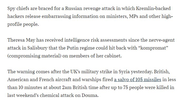 Spy chiefs are braced for a Russian revenge attack in which Kremlin-backed hackers release embarrassing information ("kompromat") on ministers, MPs and other high-profile people. #Russia t.co