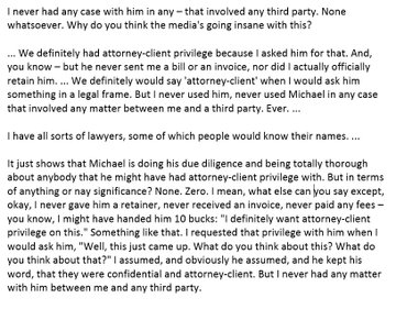 Michael Cohen has never represented me in any matter. I never retained him, received an invoice, or paid legal fees. I have occasionally had brief discussions with him about legal questions about which I wanted his input and perspective.