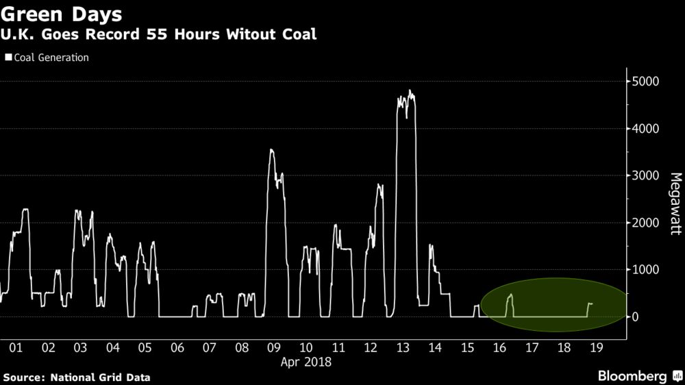 No coal was used for power generation by stations in the U.K. between 10:25 p.m. in London on Monday until 5:10 a.m. on Thursday, according to grid data compiled by Bloomberg. At the same time wind turbines produced more power.