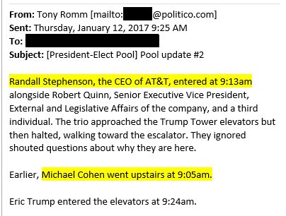A January 12, 2017 pool report from Trump Tower shows Trump lawyer Michael Cohen and AT&T CEO Randall Stephenson entering 8 minutes apart. AT&T would go on to hire Cohen "to provide insights into understanding the new administration."