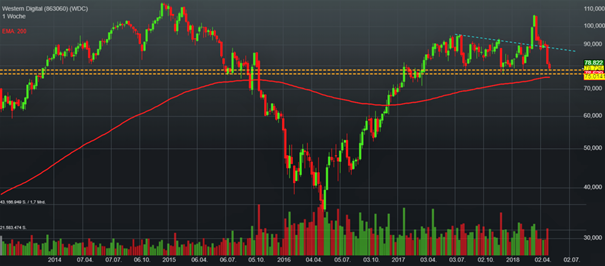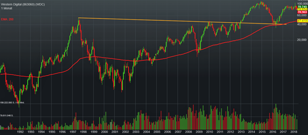 If we look at the chart of the last 25 years, we can see that Western Digital Corporation climbed during the 90s (no surprise, all tech companies did!) and reached its temporary high in 1997. It took 16 years - till 2013 - before the stock could break out over the orange line and generate new highs after the 16-year long correction. In 2016 we saw the pullback on the orange trendline as well as the 200-month exponential moving average - a great entry point by the way, as Western Digital was extremely undervalued at that point. Following the pullback, we first saw Western Digital almost triple in value within a few months and after that the correction we are still in right now.