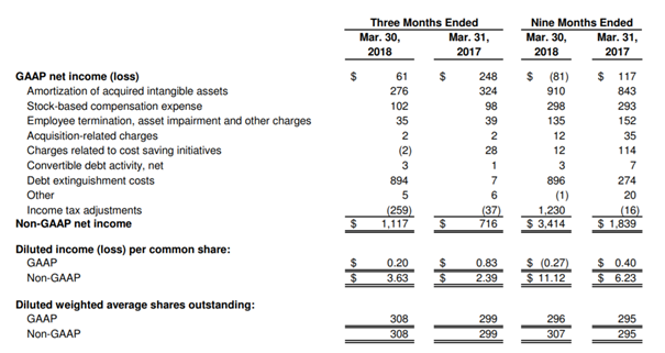 Valuation In many articles about Western Digital, authors, contributors and commentators mention the extremely cheap valuation of Western Digital, but WDC has only a low P/E ratio if you use non-GAAP numbers. According to US GAAP, Western Digital could only report $61 million in net income ($0.20 EPS) in the last quarter instead of $1,117 million ($3.63 EPS) on a non-GAAP basis. The huge difference mostly stems from $894 million in "debt extinguishment costs". I will not argue for or against GAAP accounting standard but will only point out that investors should not just pick the number they like (in case of bulls, the non-GAAP number) because it proofs their (bullish) point.