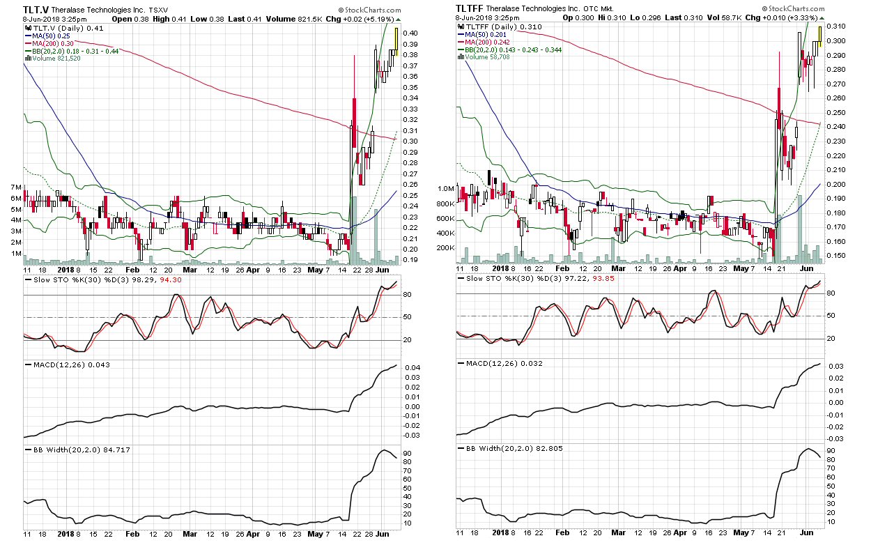 Theralase Technologies inc. [TSXV:TLT] [OTC Mart:TLTFF] Yes, Americans have access to this company through the OTC mart. Here are the 2 trigger charts side by side