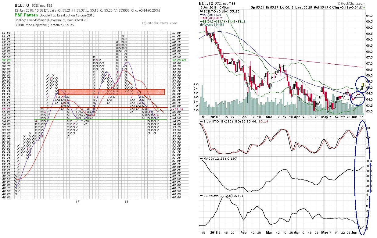 The P&F chart is not bullish as it may seem with a Double Top breakout. That dashed red line is a diagonal resistance at $55.50 which reinforces the horizontal resistance . then if that is passed it runs smack into a resistance band from $56.50 - $57.00 mildly bearish