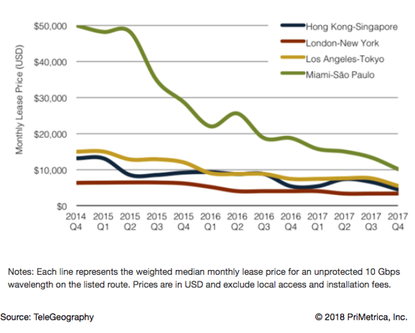 Weighted Median 10 Gbps Wavelength Price Trends on Major International Routes, 2014–2017