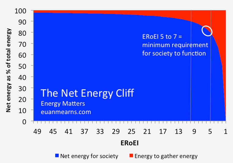 - When EROI approaches 5, forget about building - or repairing - wind turbines. Forget re-paving. Forget cheap transport and globalization. Forget mining ore and building bridges. Energy becomes a zero-sum game.