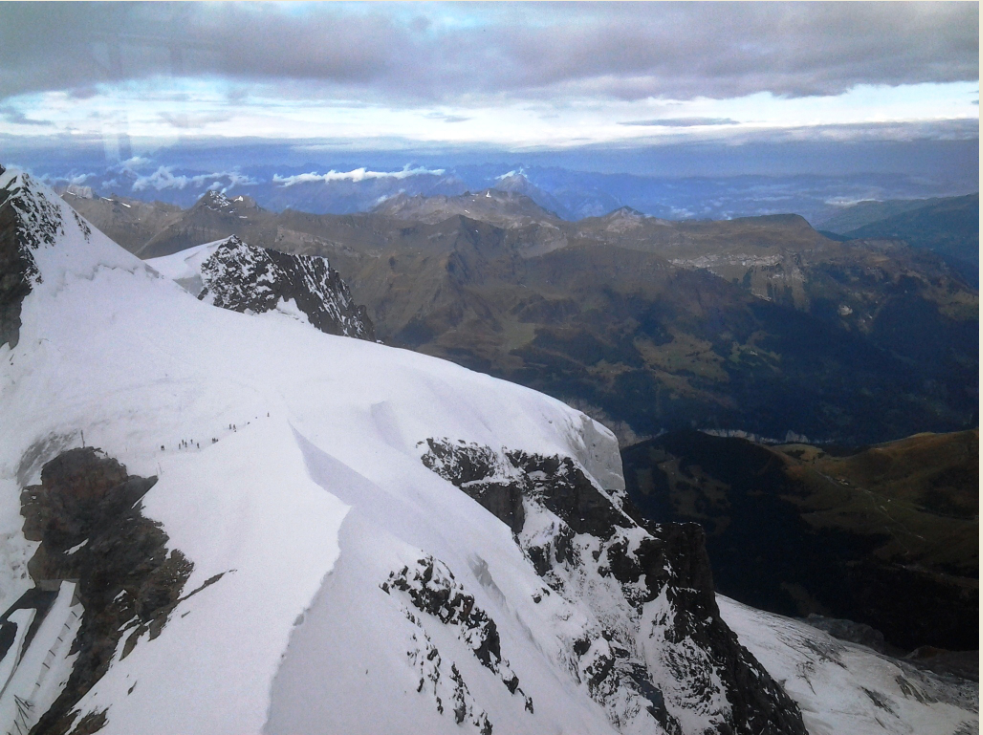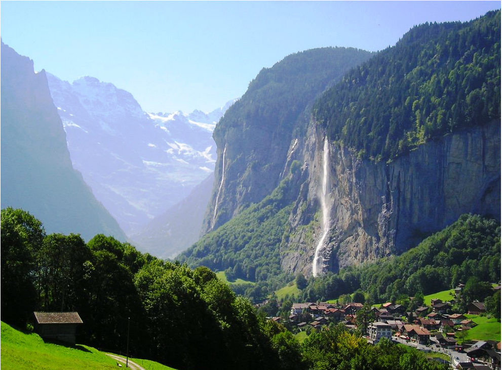 Our descent down Jungfrau was also very beautiful, we passed through a small village called Lautenbrunnen high in the alpine valley, there were cows in the meadow, and each cow had a giant bell around their necks... you could hear the bells in the distance... in the middle of the town there was a very large waterfall of snow melt coming down the mountain wall from the higher snow caps... again, the name of the town was Lautenbrunnen... laut is German for loud and brunnen is German for fountain, so the name of the town was "loud fountain" or Lautenbrunnen because of the beautiful and loud waterfall there...