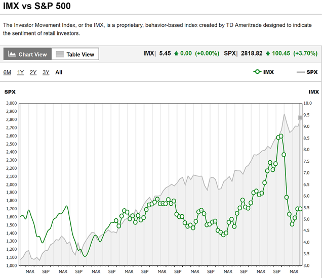 5. The Investor Movement Index: This chart is called the Investor Movement Index or IMX for short. It is put together by TD Ameritrade and it derives a composite view of investor sentiment based among other things on the activity of clients of the TD Ameritrade brokerage business. It almost looks like a case of "once bitten, twice shy" for investors here. The big hyped-up surge in sentiment late last year has been completely unwound, but investors look reluctant to get back on the horse if this indicator is anything to go by. Still, at 5.45, the indicator is around the top end of the range of the last few years, so they're hardly bearish either.