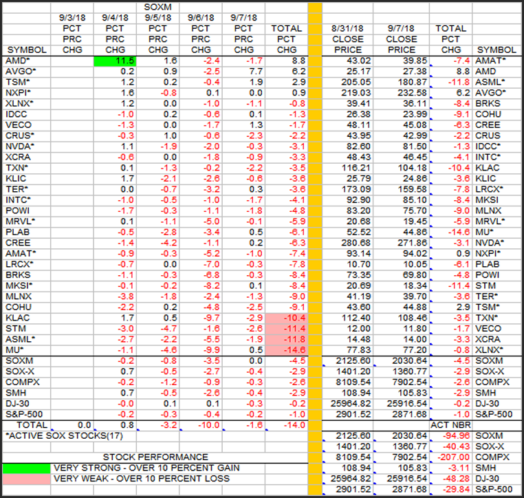 A big week to the downside, only 4 stocks up, and the remaining 24 stocks down. The bottom line number is a big red -14.0. AMD and AVGO had strong upside results. The semi indices and NASDAQ were down quite a bit more than the DOW and S&P. Micron took the biggest hit, down -14.6%.
