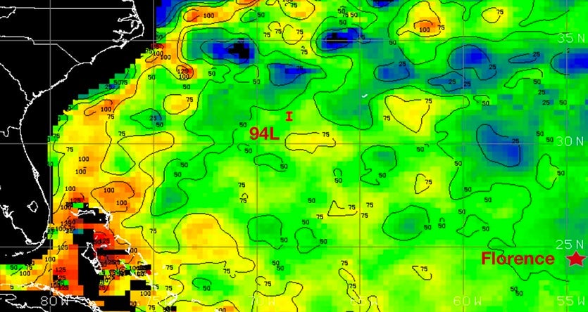 Something to watch with 94L, though--I saw a presentation a few years ago that showed that Hurricane Katrina of 2005 increased markedly in size after it absorbed a small area of disturbed weather over the southeast Gulf of Mexico and acquired more moisture and spin. If Florence manages to absorb 94L, the increased spin the combined system will have may act to expand Florence's size considerably, leading to a larger storm surge and an increased area of wind and rainfall impacts. Satellite images on Saturday morning showed some of 94L’s moisture heading towards the northwest flank of Florence, but it is unclear at this point if Florence will pass close enough to 94L to get a significant boost in moisture and spin.