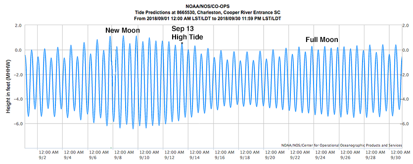 It is too early to tell when Florence’s storm surge might arrive with respect to high tide or low tide. However, we can look at the monthly tidal cycle and see that Florence’s likely closest approach to the Southeast U.S. coast on September 13 corresponds to an increased risk of storm surge damage, due to the phase of the moon.