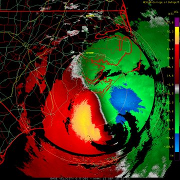 | | Figure 2. Hurricane Ione, also once a Category 4 storm (on September 18, 1955), crept ashore as a much weaker Category 2 storm with 105 mph winds and a central pressure of 955 mb on September 19, and drifted for 7 - 8 hours between Morehead City and New Bern, NC. Prolonged easterly winds forced the tides to increase up to 10 feet above normal, which resulted in one of the largest storm surge inundations in North Carolina history. | Stay safe if you are in the path of this dangerous storm! |