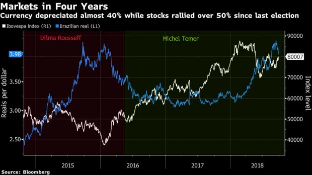 Stocks, the currency and bonds surged to multiweek highs in the past few days as new polls showed former army captain Jair Bolsonaro gaining support. The jump in popularity probably won’t be enough for him to win office outright in the first-round vote, but for the first time these surveys show him with a fair chance of coming out ahead in the second round later this month.