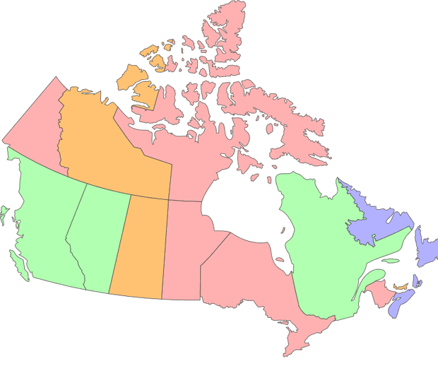 Green indicates that the province’s own carbon pricing system meets the federal standards. Purple and orange indicate a province’s planned or proposed carbon pricing will meet the federal standards, respectively. Red indicates that the federal carbon pricing will apply to the province. Illustration: Dana Nuccitelli