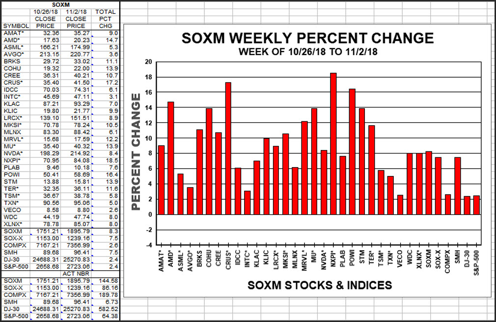 This is the weekly look at the performance of the SOXM stocks and major indices in actual and percent terms in table and chart formats.