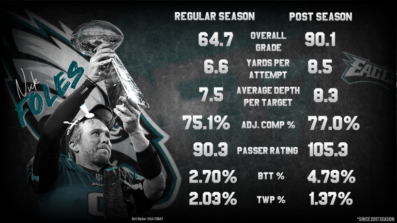 Over the course of the 2017 postseason, which included games in the Divisional Round, the Conference Championship and the Super Bowl, Foles completed 77-of-109 attempts for 971 yards, six touchdowns and one interception, which generated a passer rating of 115.7 – the fourth-best mark ever recorded by a quarterback in a postseason within the PFF era (2006-present).