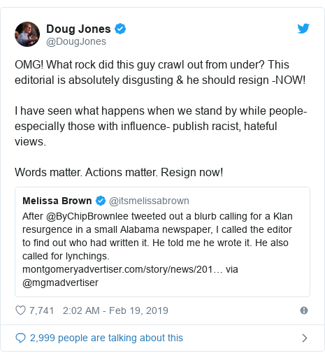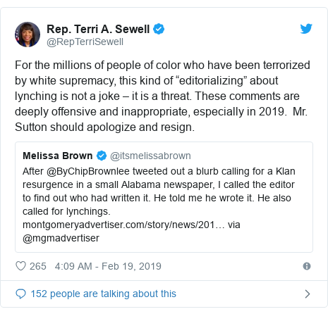 Image copyrightDAVID HOLLOWAY VIA GETTY IMAGESImage captionKlan members light torches at White Heritage Days Festival in Alabama in 2004What's the reaction?Alabama Senator Doug Jones, the Democrat who won a bitter race against Republican Roy Moore, expressed his shock over the "absolutely disgusting" editorial and said Sutton must resign immediately.