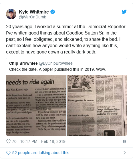 Kyle Whitmire, a political writer in Alabama, said he once worked at Sutton's paper and felt "sickened" by last week's editorial.