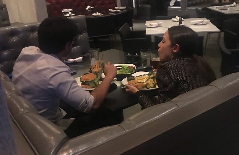 AOC eyeing yummy cheese-burger, trying to stop global warming with every bite.