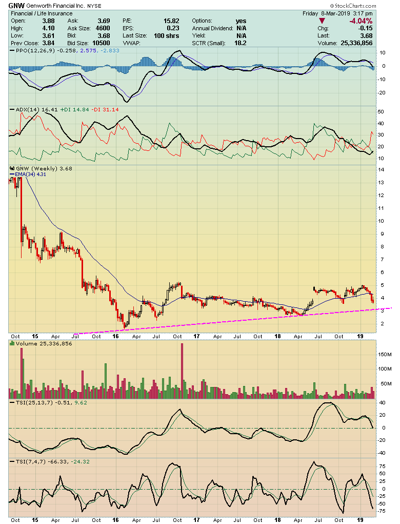 The GNW daily pincher might be mature as the weekly price hits the rising trendline. Might.