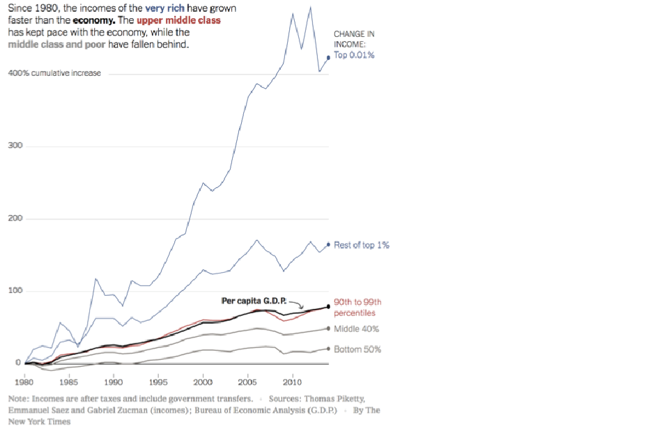 In the Chart below: Upper middle class is 90th to 99th percentile, making $120k to $425k after tax. Their income growth is at par with the GDP growth. Middle, lower middle and poor people lost ground for the past 40 years, with their income growth falling further below the GDP growth, while the Top1% gaining ground with their income growth much in excess of the GDP growth. The Top0.01% Billionaires saw their income growth sky rocket.