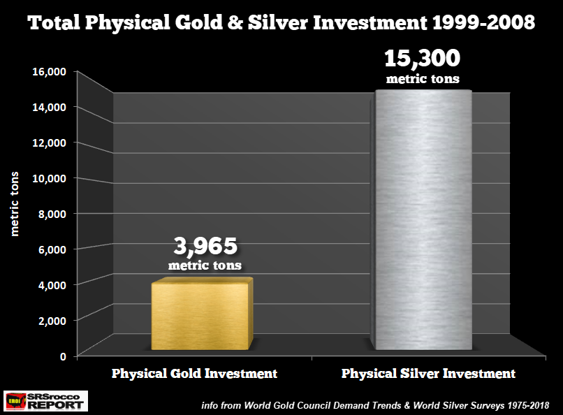 Total global gold physical investment from 1999-2008 was 3,965 mt versus 15,300 mt for silver. If we combine the information from both charts into one, investors purchased four times more physical gold and silver after the 2008 financial crisis: