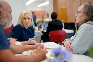 Senator Kirsten Gillibrand, Democratic presidential candidate, talks to Iowa residents who were displaced by flooding. Photograph: Nati Harnik/AP