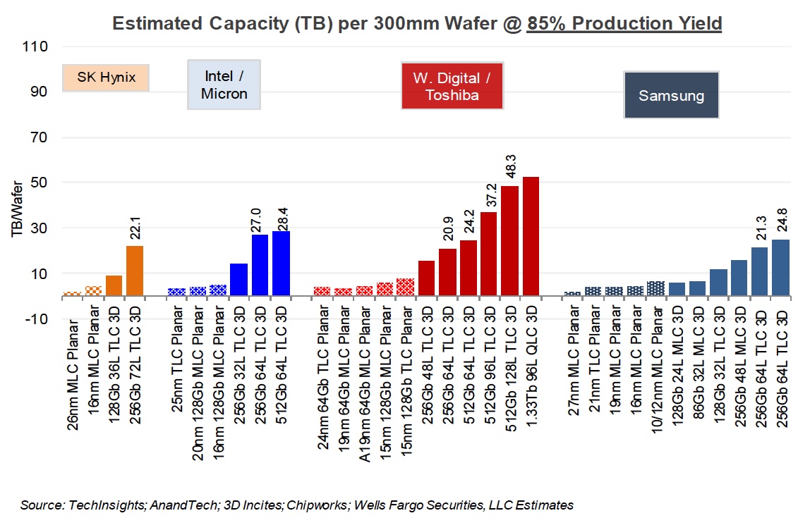 Wafer-thick Senior Wells Fargo analyst Aaron Rakers has built a production model that assumes 66mm2 die size and a 7.8Gb/mm2 bit density rating. He thinks WD-Toshiba has the industry’s highest NAND density and models the suppliers at an 85 per cent wafer yield: