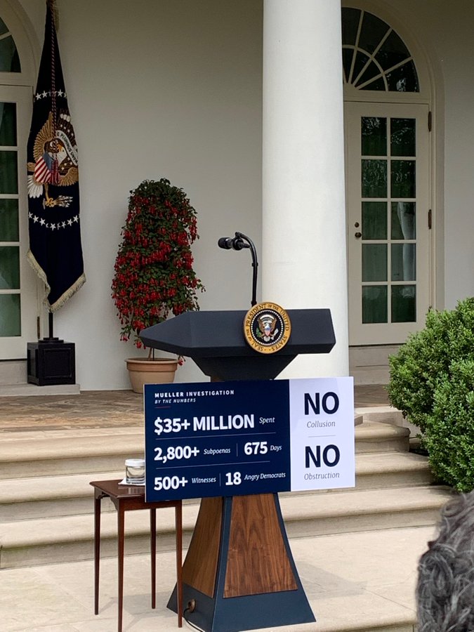 Podium set up in the Rose Garden with statistics on the Mueller investigation.