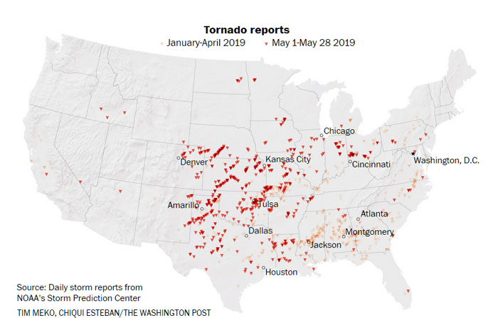 The immediate driver of the violent weather is the jet stream, the powerful winds at high altitudes that sweep west to east across North America. The jet stream since May 14 has created conditions ripe for twisters. Seven deaths have been reported so far in the tornado assault of May. That’s a low death toll compared to some tornado seasons, but the steady, percussive nature of the storms — the daily pounding — has been anomalous.