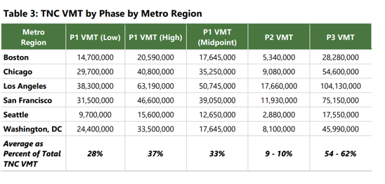 (Fehr & Peers) _____________________________~ ~ The new findings show that Uber and Lyft account for just 1-3 percent of total VMT in the larger metropolitan regions surrounding the six cities. But they have a far heavier traffic impact in core urban areas, as the table below shows: In San Francisco County, Uber and Lyft make up as much as 13.4 percent of all vehicle-miles. In Boston, it’s 8 percent; in Washington, D.C., it’s 7.2 percent.