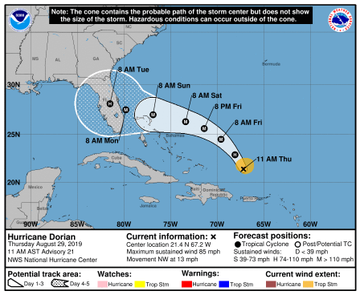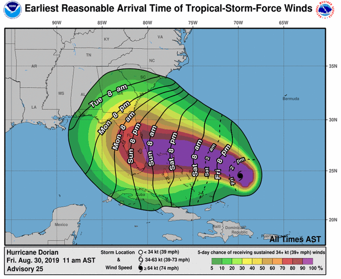Tropical-storm-force winds from #Dorian could begin in parts of Florida *as early as* Sunday morning. Now is the time to think about what kinds of preparations you might need to make and listen to advice from your local emergency officials t.co