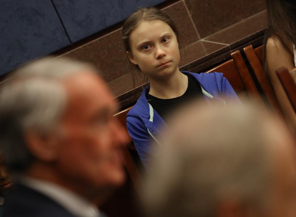 WASHINGTON, DC - SEPTEMBER 17: Greta Thunberg, the 16-year-old climate change activist from Sweden, casts a wary eye on Sen. Edward Markey during a Senate Climate Change Task Force meeting on Capitol Hill. (Photo by Mark Wilson/Getty Images)