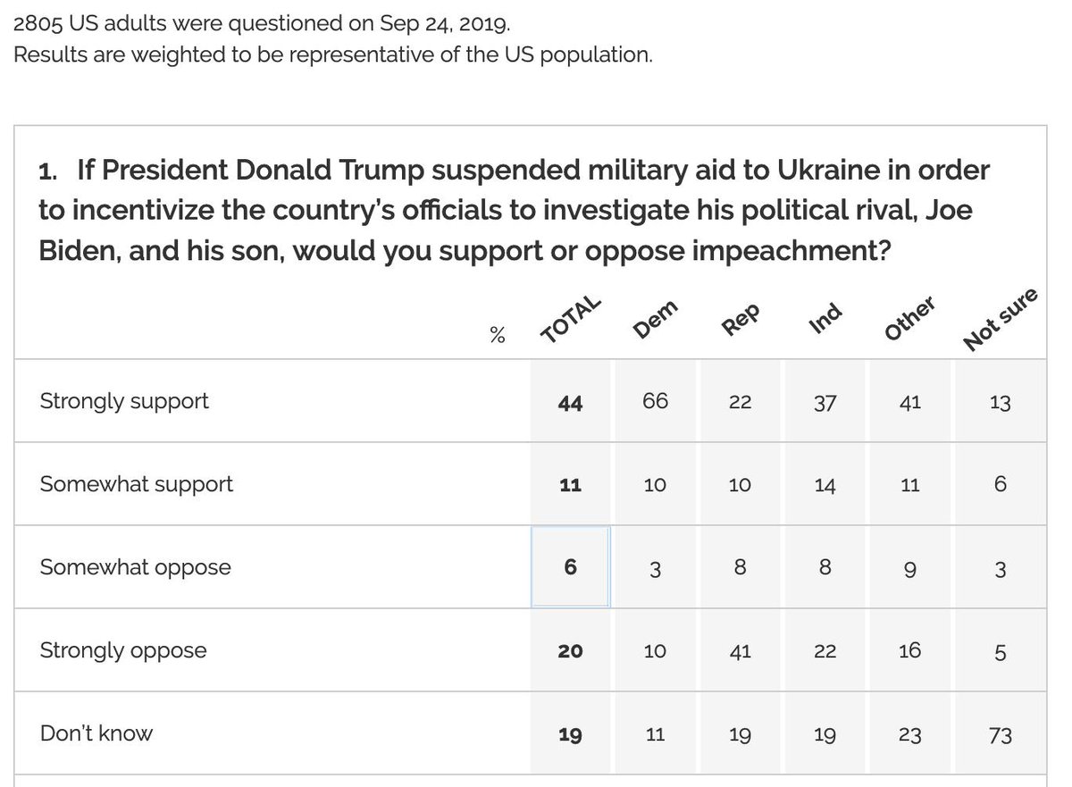 Wow. Tide is shifting *very* quickly. 22% of Republicans strongly support impeachment, 10% of Republicans somewhat support impeachment. Only 49% of Republicans oppose impeachment. …