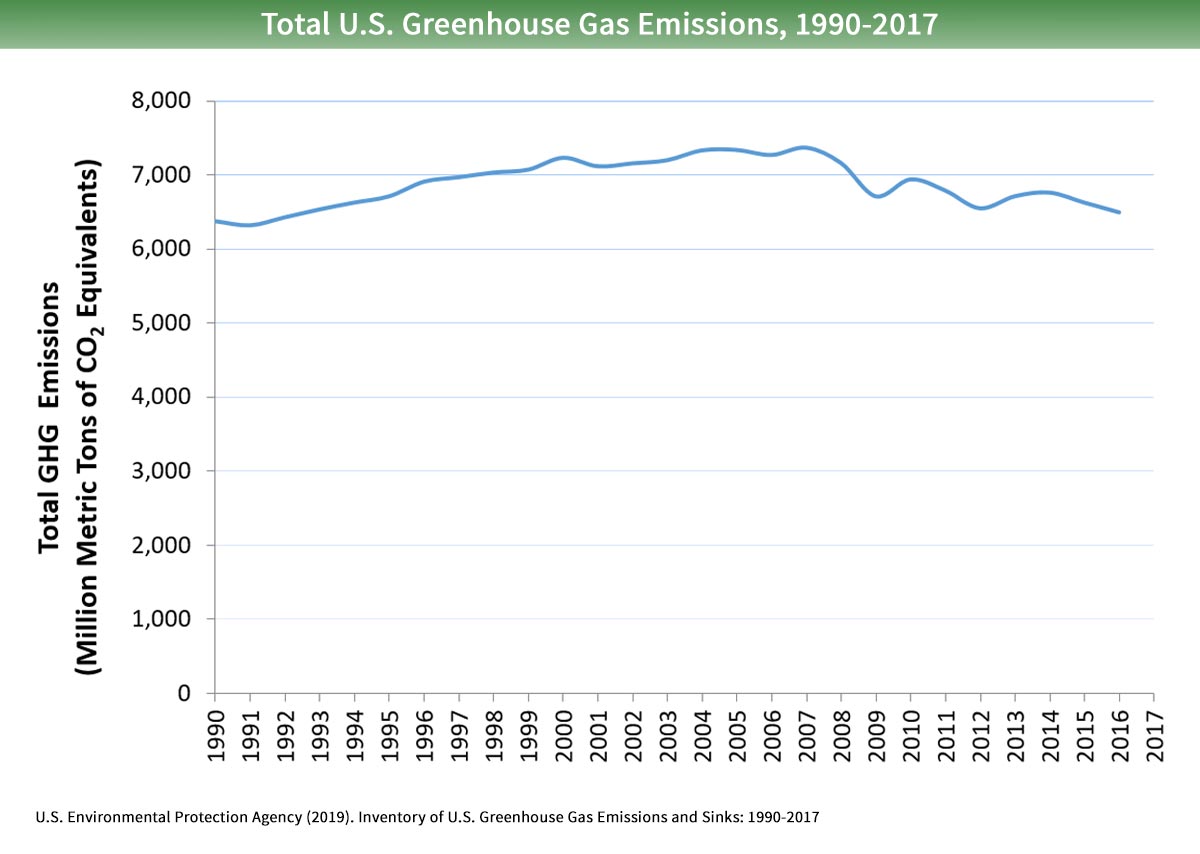 Transportation (28.9 percent of 2017 greenhouse gas emissions) – The transportation sector generates the largest share of greenhouse gas emissions. Greenhouse gas emissions from transportation primarily come from burning fossil fuel for our cars, trucks, ships, trains, and planes. Over 90 percent of the fuel used for transportation is petroleum based, which includes primarily gasoline and diesel. 2 Electricity production (27.5 percent of 2017 greenhouse gas emissions) – Electricity production generates the second largest share of greenhouse gas emissions. Approximately 62.9 percent of our electricity comes from burning fossil fuels, mostly coal and natural gas. 3 Industry (22.2 percent of 2017 greenhouse gas emissions) – Greenhouse gas emissions from industry primarily come from burning fossil fuels for energy, as well as greenhouse gas emissions from certain chemical reactions necessary to produce goods from raw materials. Commercial and Residential (11.6 percent of 2017 greenhouse gas emissions) – Greenhouse gas emissions from businesses and homes arise primarily from fossil fuels burned for heat, the use of certain products that contain greenhouse gases, and the handling of waste. Agriculture (9.0 percent of 2017 greenhouse gas emissions) – Greenhouse gas emissions from agriculture come from livestock such as cows, agricultural soils, and rice production. Land Use and Forestry (offset of 11.1 percent of 2017 greenhouse gas emissions) – Land areas can act as a sink (absorbing CO2 from the atmosphere) or a source of greenhouse gas emissions. In the United States, since 1990, managed forests and other lands have absorbed more CO2 from the atmosphere than they emit. Emissions and Trends Since 1990, gross U.S. greenhouse gas emissions have increased by 1.3 percent. From year to year, emissions can rise and fall due to changes in the economy, the price of fuel, and other factors. In 2017, U.S. greenhouse gas emissions decreased compared to 2016 levels. The decrease in CO2 emissions from fossil fuel combustion was a result of multiple factors, including a continued shift from coal to natural gas, increased use of renewables in the electric power sector, and milder weather that contributed to less overall electricity use.