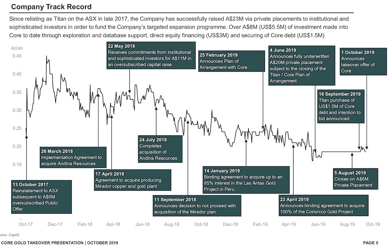 1) February 25, 2019 (Australia) - Titan Minerals’s first bid for Core, via merger / Plan of Arrangement.