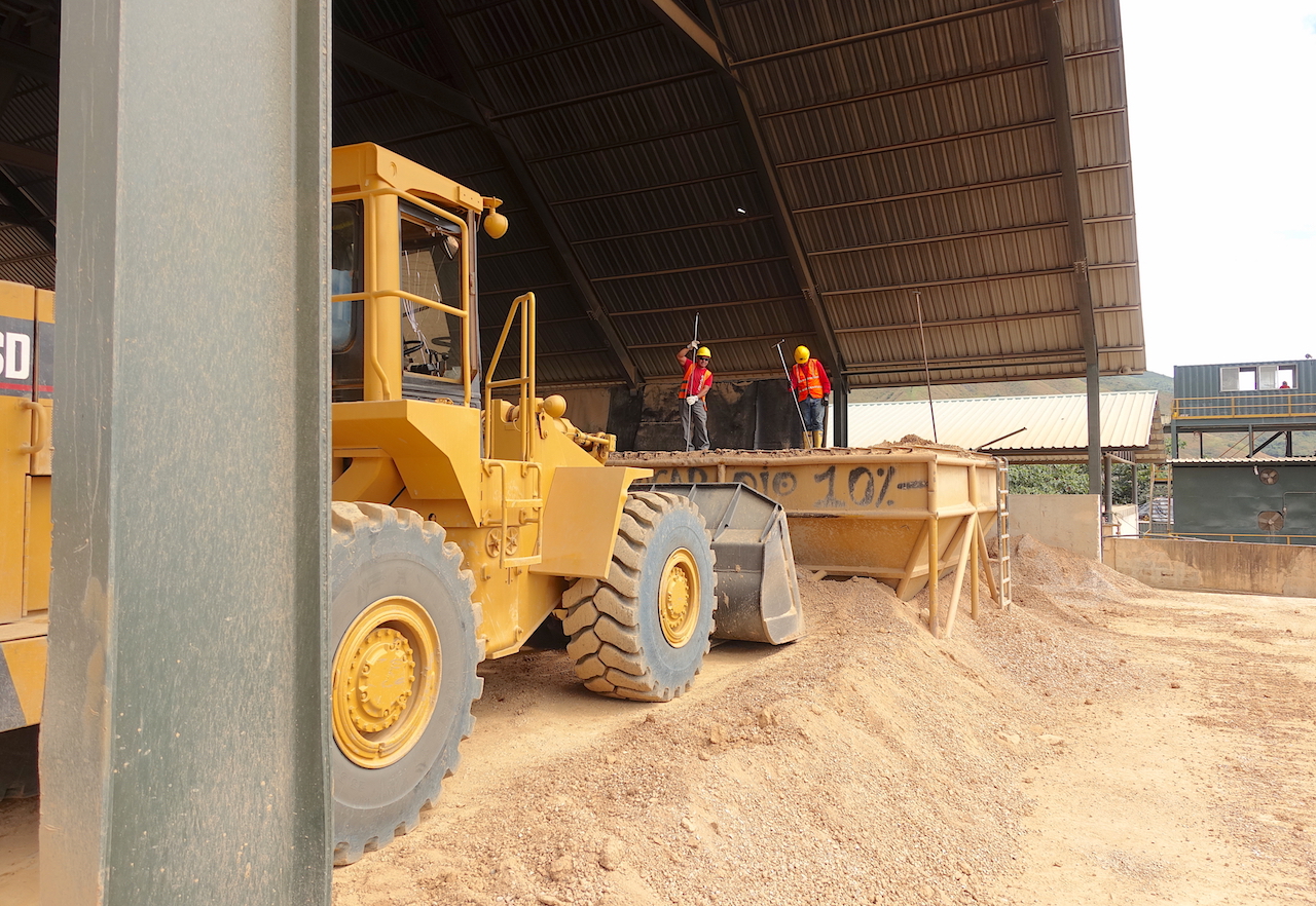 Photo below - a shed houses the process stockpile, where ore is fed into a grizzly to filter out larger rock. Workers periodically clear the grizzly of stones lodged in its grate. The ore falls from the grizzly onto a conveyor in a tunnel, which distributes it to the ball mills for fine grinding.
